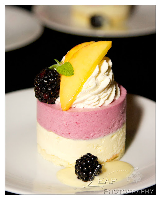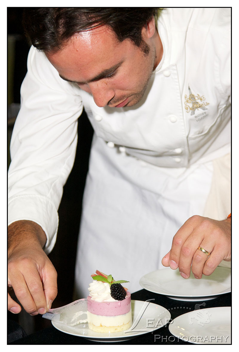 Chef Mathiew Chloux preparing the final course, Layered white chocolate and blackberry Bavaroise.